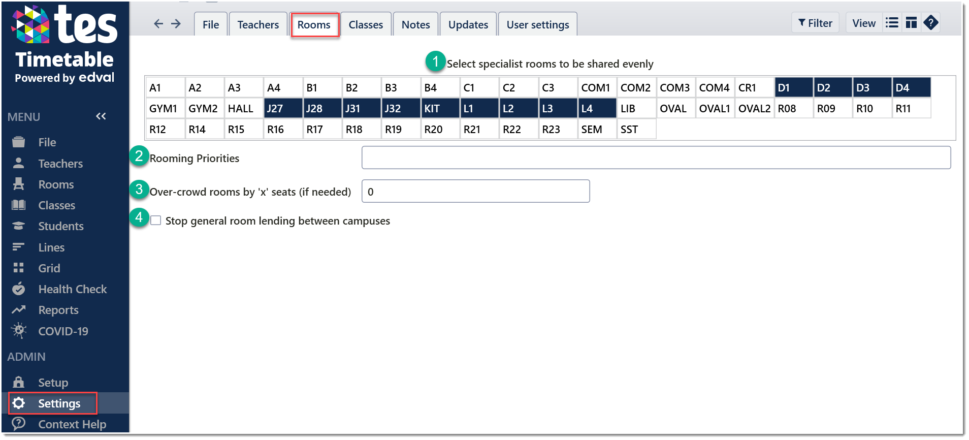 During auto-rooming, E10 attempts to give a single room to a class for all lessons. However, for certain specialised rooms, the preference may be to distribute usage evenly so each class gets the same number of periods in an ordinary classroom. These rooms are also prioritised for double-periods over single periods.