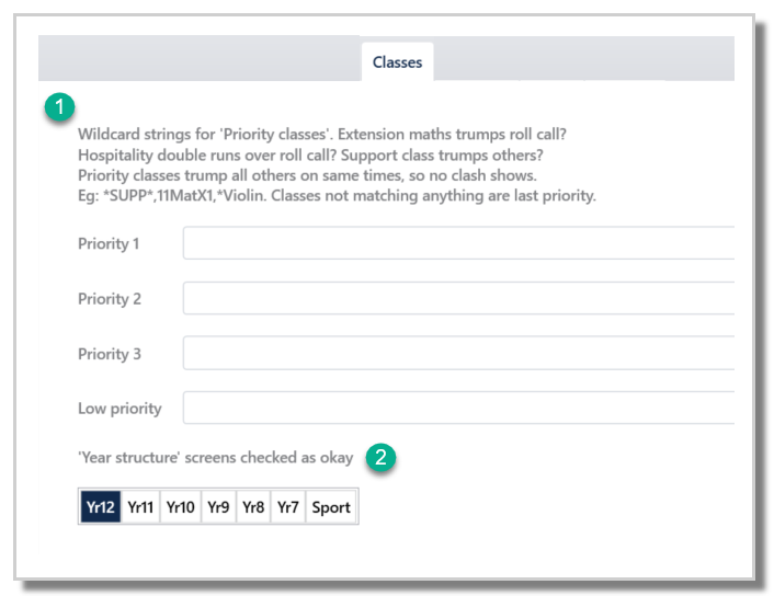 When students have class list clashes, they generally go to a more 'important class' any time there is a clash. This feature allows you to specify 'which' subjects are more important than others. An example may be that a Support class trumps others or that Extension classes trump others. It is rare to have more than one priority subject, as this is specifying which class to attend out of a possible three-way clash in class lists, or where an important subject should trump one but not another subject. This feature allows you to extract students to some occasional activities (Violin), or classes (Extension Maths), while ensuring class lists are always accurate and rolls are always accurate.