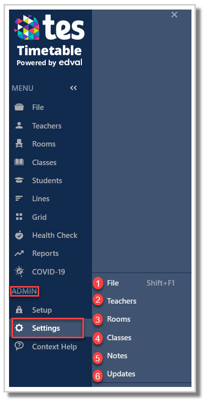 The Settings tab in the ADMIN Menu section contains six (6) subsets / areas in which school data can be edited. Certain issues within various screens of the .etz timetable file can stem from incorrect data entered in Settings.