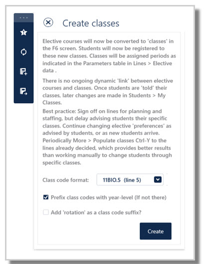 Once the elective lines have been accepted and finalised, the next step is to 'Create classes', which transfers all the classes information from the elective lines into the Classes > Class data screens.
