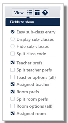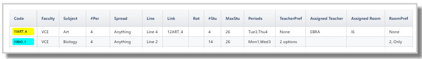 Ensure the 'View Fields to show' drop down has the following four columns displaying: Teacher prefs, Assigned teacher, Room prefs and Assigned room. - Periods: If the 'Fix Lines to periods' table was used, the period codes will display, effectively forcing these classes onto the grid.