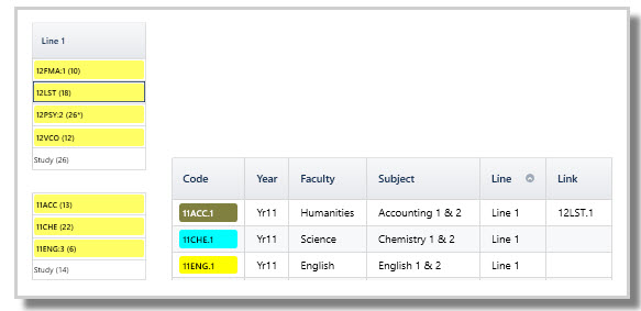 Example: Year 11 and 12 have had lines generated together. When classes were created, an entry was added into the Line 1 11ACC.1 class to link it to the Line 1 12LST.1 class. When Line 1 is placed onto the grid, all Line 1 classes in Years 12 and 11 will be timetabled onto the same period. - #Per: the number of periods will match the value entered into the line parameters. This can be easily changed if required.