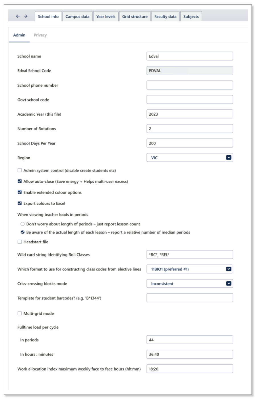 Work allocation index maxumum weekly face to face hours (hh:mm): This displays only in files with a region of VIC and is used in conjunction with the Work Allocation Index report (formerly the 480 index report). As the maximum weekly face to face hours is now subject to change (was previously 20 hours), it is now important to enter the required maximum, in hours and minutes, for example 19:30. If nothing is entered here, the report will use a default value of 20 hours. Refer to E10 - Reports: Teachers: Work Allocation Index for details on how the Work allocation index report functions.