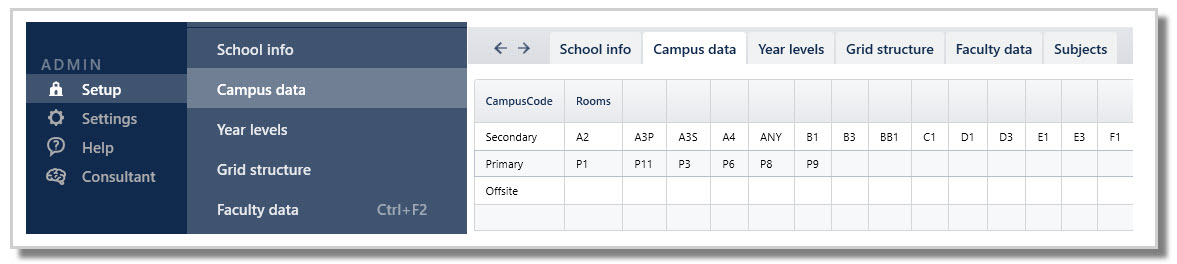 *Note that associating rooms to each campus can be more easily done in Rooms > Room data > 'Campus' column. The Campus data screen will be populated as per the Room data screen.