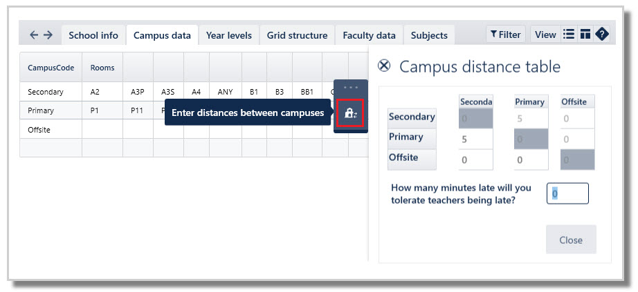 - manage teacher movement across campuses (Grid > Master grid > Action bar: Weights - Movement of teachers) - Using the Auto-room feature after the timetable is constructed. (Rooms > Room allocations > Action bar> Auto room)