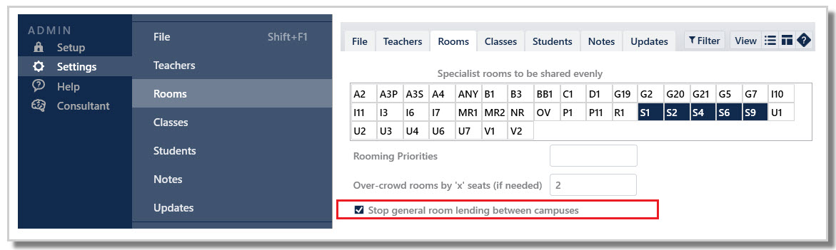 Each teacher may be assigned to a main campus for filtering and viewing purposes. Ensure that the column 'Main campus' is selected from the View options. - Rooms: Rooms > Room data