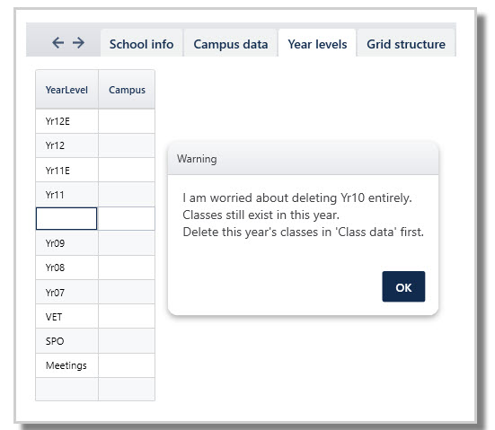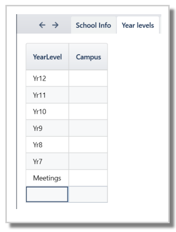 Year levels 7 to 12 and 'Meetings' are standardised in most school files. Year levels may need to be added, changed, or edited. This can be done by going to Admin > Setup> Year Levels.