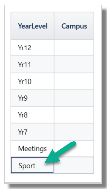 Select the blank cell at the bottom of the list and type in the name of the new year level, e.g. SPT, SUP, 9+10.