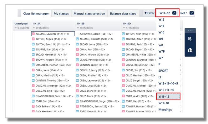 When needing a year level for class list management purposes, navigate to Students > Class list management, select the Filter menu on the top right of the screen, and select the desired umbrella year level from the drop-down.