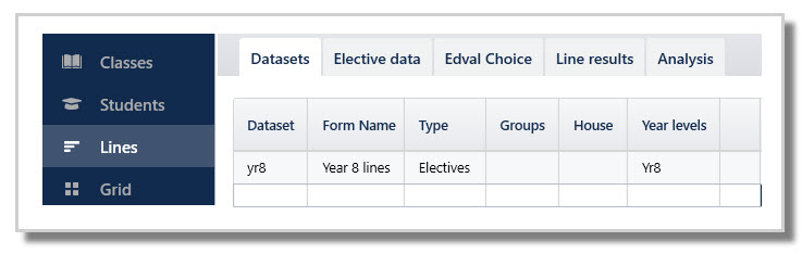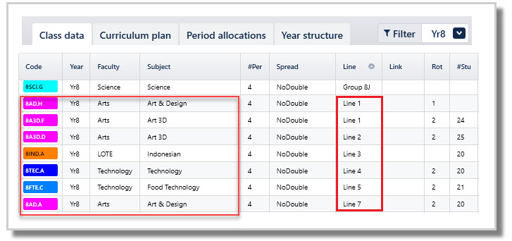 The Class data screen below shows the Year 8 classes that are on lines. These are the classes that need to be set up in the Electives data screen so that new lines can be created.