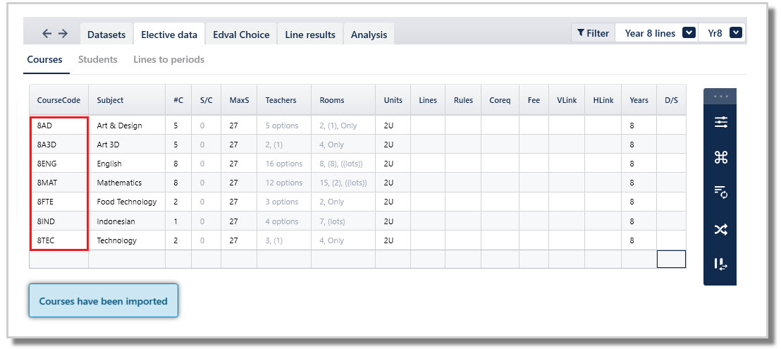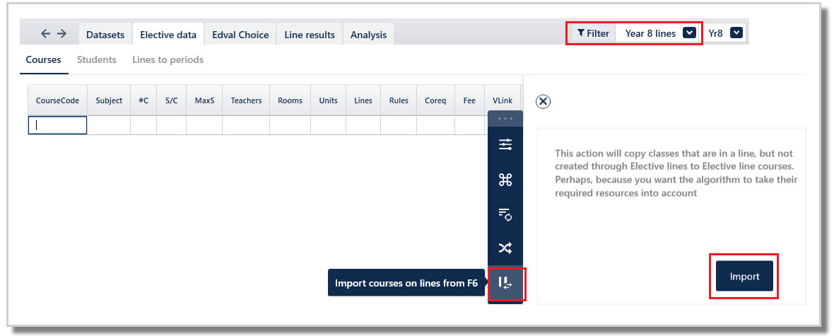 Sometimes a user might like to import subjects to populate the elective data screens in order to collect students' preferences and generate lines. An import of course data can occur from a spreadsheet, however, if the courses already exist in Class data (F6) screens, then a spreadsheet import is not required.