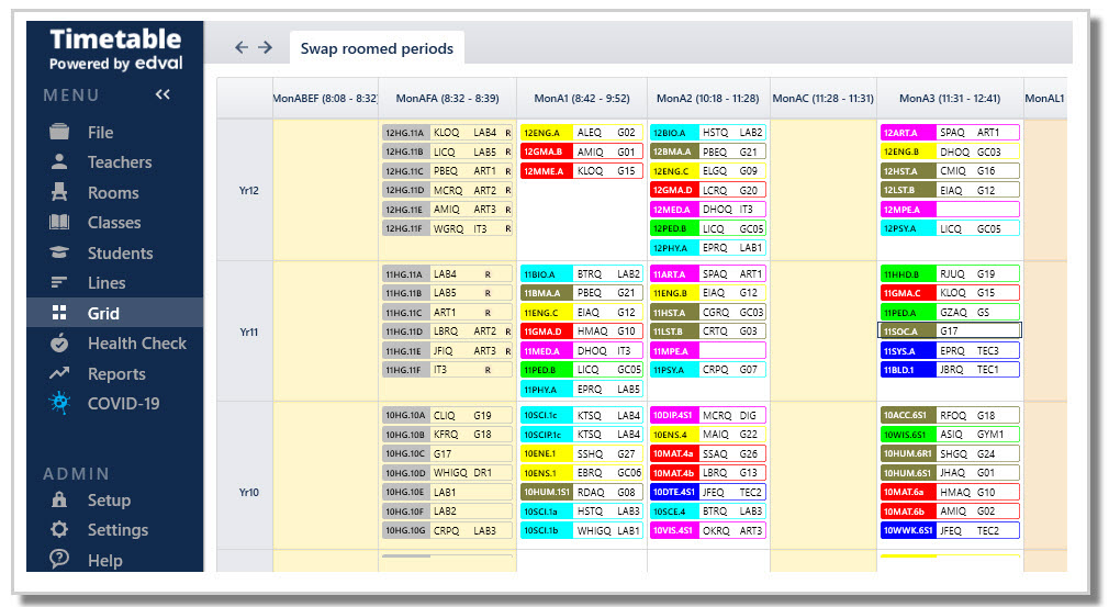 A grid will display the whole school timetable. Column headings show the periods, and rows on the left hand side show each year level.