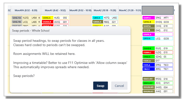 A timetable has been constructed and the room allocations assigned. The school then decides that they wish to swap all Monday Period 1 classes with all Monday period 3 classes. In this case, we would want to keep the room allocations exactly the same, as we are simply swapping all classes from one period to another.