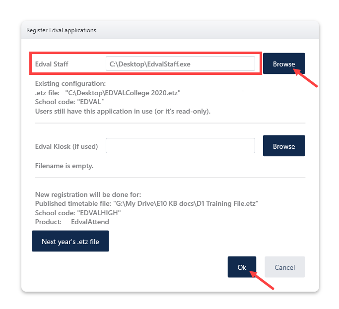The 'Register Edval applications' window will prompt. Browse for the Edval Staff application and hit OK.