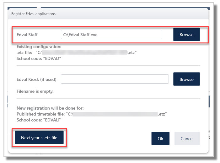 - Browse to locate next year's .etz timetable file.