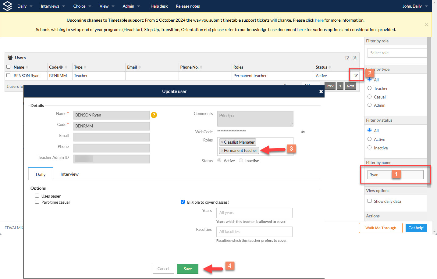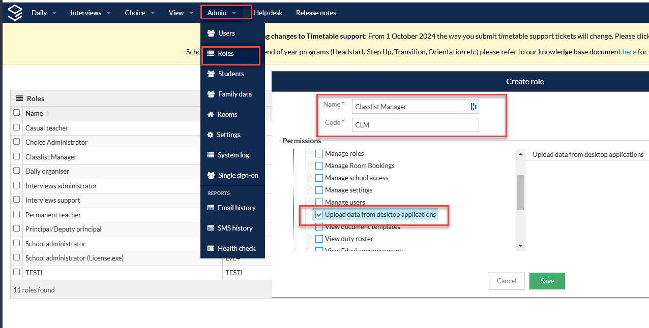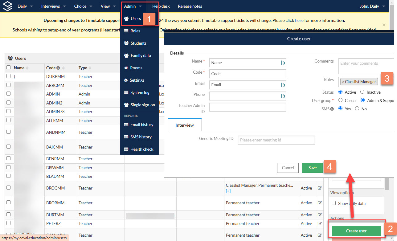 - If user exist, simply click on edit against the user and add the additional new role for classlist changes that you have created