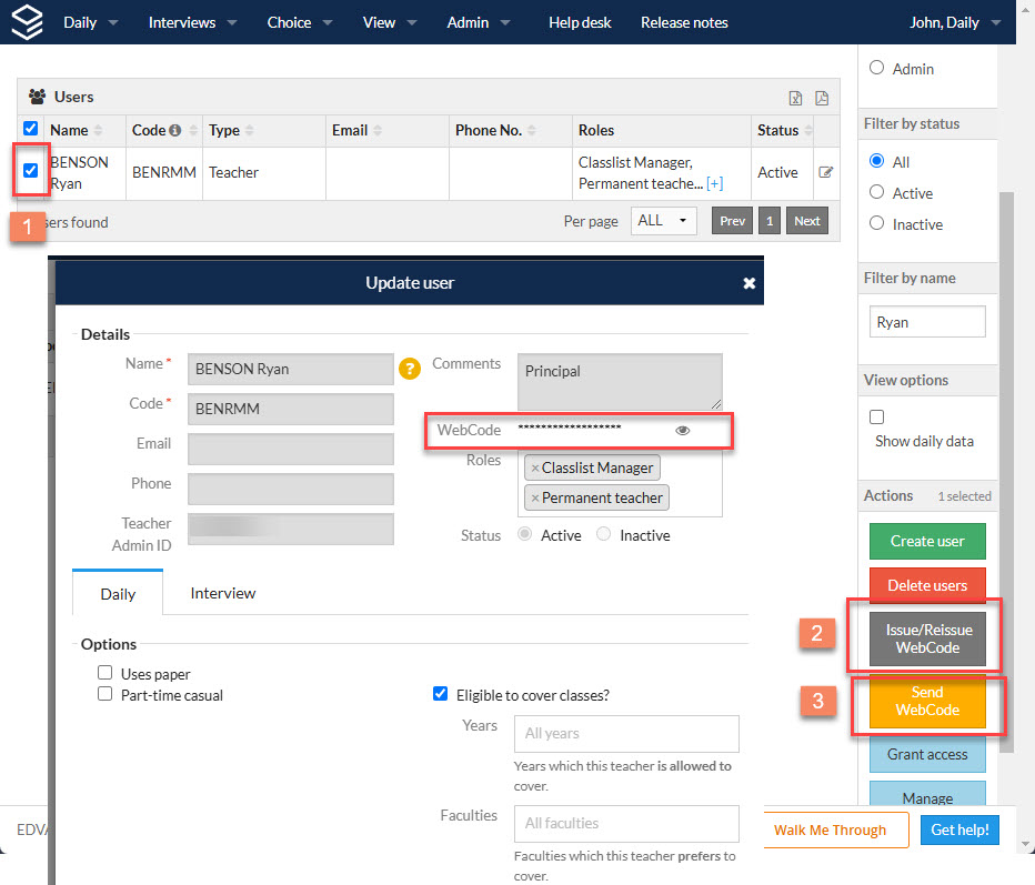 - Once the above steps is done, select the user from the list and click "Issue/Reissue webcode" , This step will generate the webcode for selected user.