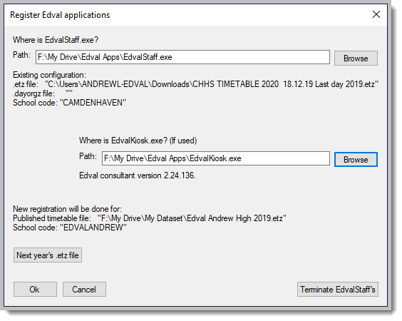 The EdvalStaff and EdvalKiosk applications are unique to each school, as the school’s timetable file locations are embedded directly into the software itself. Users then need only have shortcuts to the application which is stored on the server (and not on individual users PC’s). To avoid the need for configuration files, Edval will inject your current timetable file paths, directly into the EdvalStaff and EdvalKiosk applications. You need to ensure the exe file is not set to read only, and not in a read only location, as the registration process will need to write to the file to inject the timetable path details.