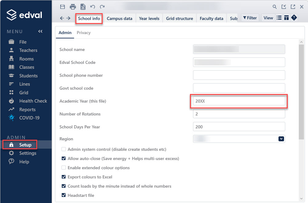 If the school wishes to sync their next year's timetable file to Timetable Daily Headstart dataset then they need to make sure to set the timetable file academic year to the current year. School can change the year once the current academic year is finished. You can do this change in E10 > Setup > School Info > Academic Year.