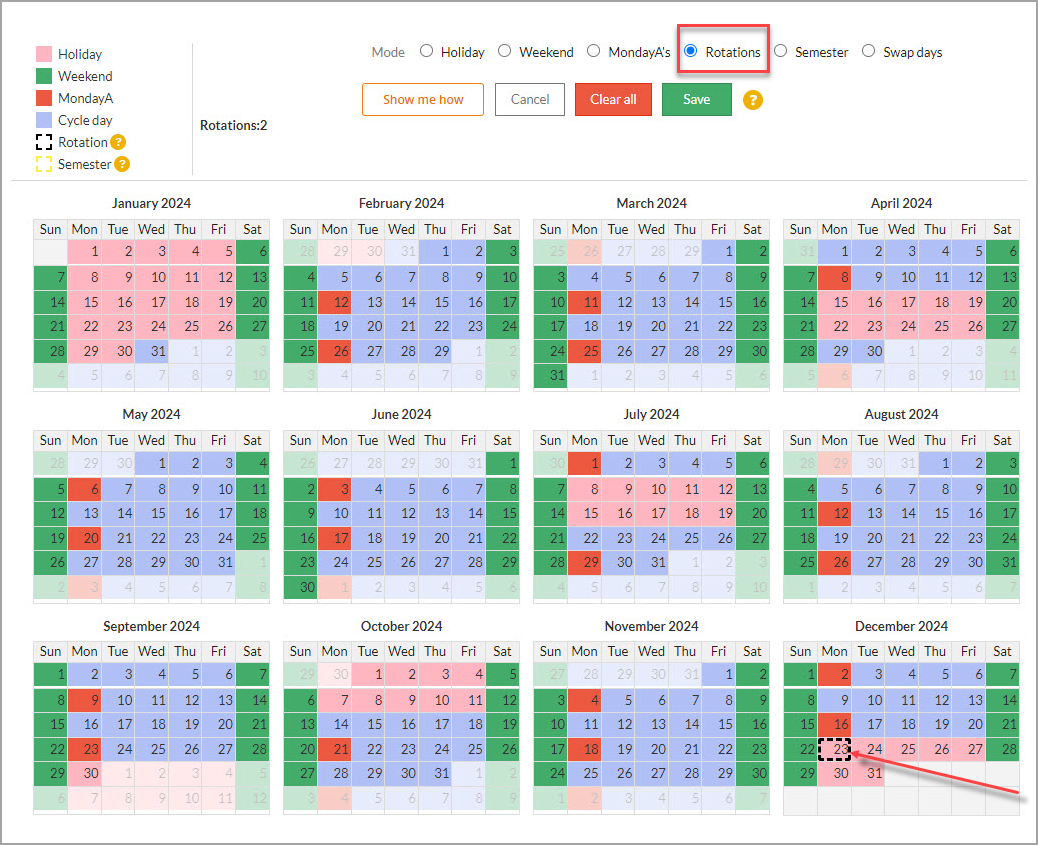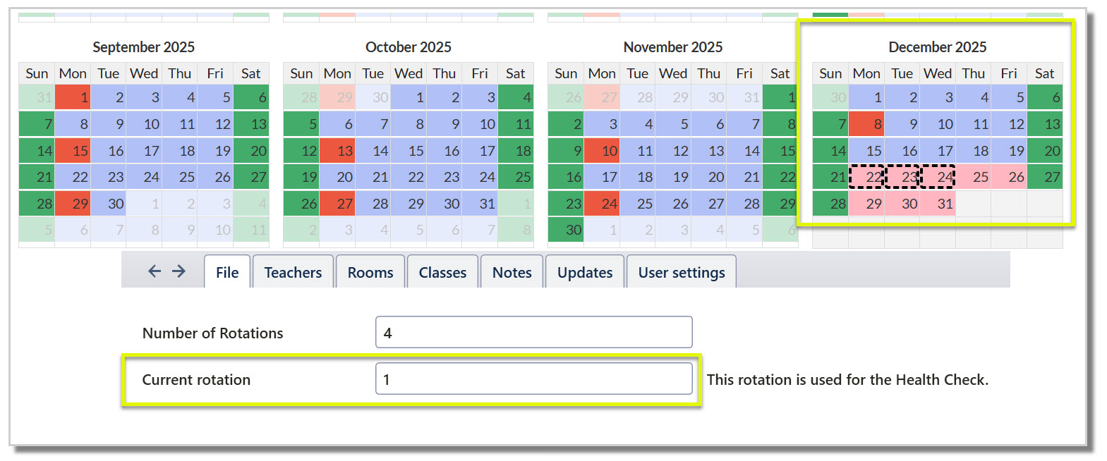 6. The Timetable Daily rotation in Daily > Settings > Date Mapping should match with what rotation the new timetable file is set to, which can be found in E10 > Settings > File > Current Rotation. For example, if the timetable file has two rotations and the current rotation is set to '1' in timetable file, Timetable Daily date mapping should be set so that the current date is in  rotation 1. This can be done by moving the rotation 2 marker to the end of year and setting it in the school holidays, putting the current date in rotation 1. This only applies to datasets that have more than 1 rotation