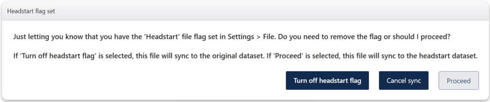 This will open a dialogue mentioning the fact that the Headstart flag is selected. This is a warning in case the file is meant to be synced to the original dataset.