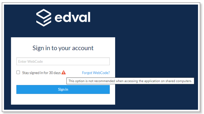 Stay signed in for 30 days - You can tick this box if you would like Tes to remember you for 30 days. Your session will be remembered only if the browser's cache and cookies are not cleared. As per the tooltip, this option is not recommended when using shared computers or devices. Please keep in mind that this is different to the browser’s remember password behaviour. If you choose your browser to remember the WebCode then there is no time limit and it will always remember the WebCode.