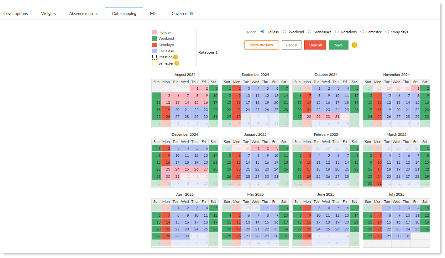 It is essential that every date in the year is defined (each day must have a colour other than white) otherwise date mapping will not work correctly. In the example above August 26th has been made a Monday A in order to define the first week of the school year as being in Week A.