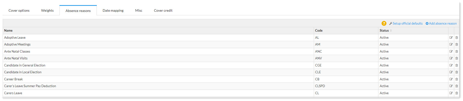 Go to Daily > Settings > Absence Reasons. Click the blue Add absence reason link, give the reason a name and code then save. Absence reasons can be edited at any time by clicking on the pencil icon at the right of the row for that absence reason. Absence reasons can be deleted by clicking the trash can icon next to the pencil icon. Clicking on ‘Setup official defaults’ will populate the table with the official Irish absence reasons.