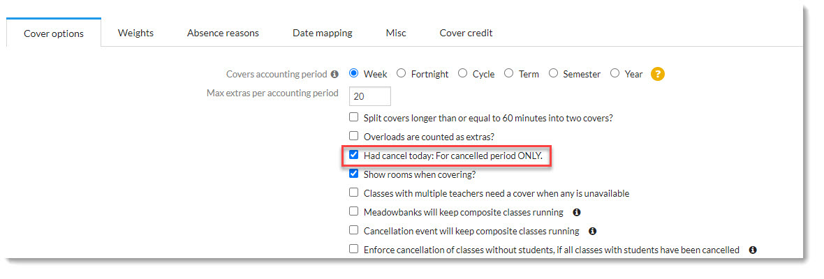To ensure that ‘Windfall’ covers are only given to teachers who have lost a class in the selected period, you will need to go to Daily > Settings > Cover options and tick the box for Had cancel today: For cancelled period ONLY.
