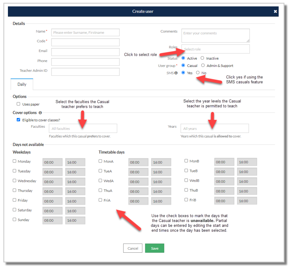 Go to Admin > Users. Click on the green Create user button to open the Create user window. Enter the user name, code (required), email and phone (optional). Assign their role as Casual teacher. Select the Active radio button. Select the user group Casual radio button and further details will become available.