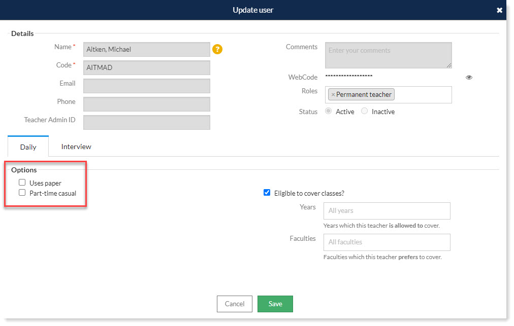 Part-time teachers can be flagged as ‘Part-time casuals’, enabling them to be assigned ‘Relief’ covers when employed as a casual teacher on their non-teaching days. To flag a teacher as a part-time casual, go to Admin > Users, locate the record for the part-time teacher and select the ‘edit’ button. On the form that opens, tick the box for ‘Part-time casual’ and save.