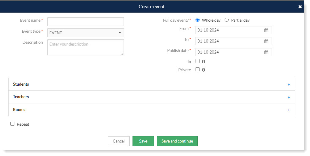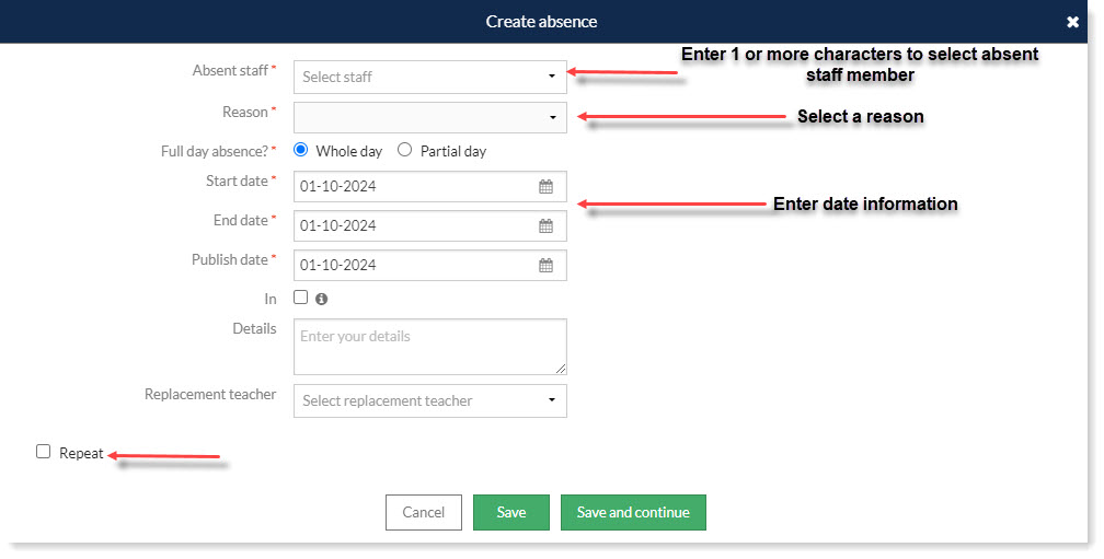 Go to Daily > Home > Absences. Click on Create absence to open the Create absence window. Enter the details of the absence.