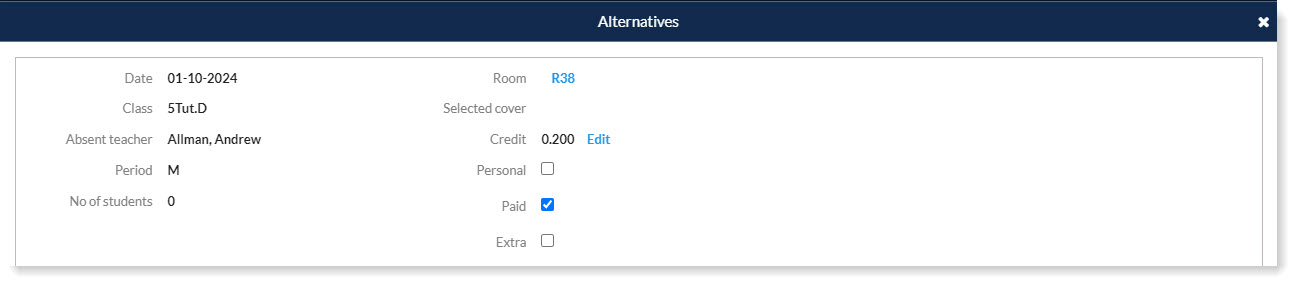 To assign a ‘Paid’ cover, tick the ‘Paid’ checkbox in the alternatives panel. This will assign a Paid cover to any available teacher selected. Paid covers have credit but do not count towards a teacher’s S&S tally.