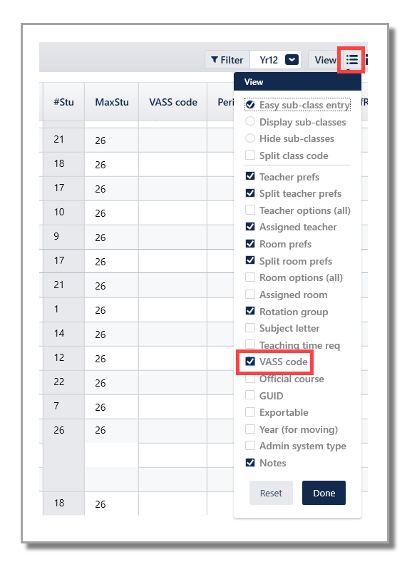 - The VASS Administrator must be informed of the E10 Class code IDs and which teacher is taking each class. Year 12 and 11 Class data (F6) screens can be easily taken to Excel by hitting the Excel icon. Columns not needed can then be easily deleted, leaving the column with the relevant information: Code, Subject, Line (optionally entered into VASS) and Assigned Teacher. Check the View options (top-right) if columns are not displaying.