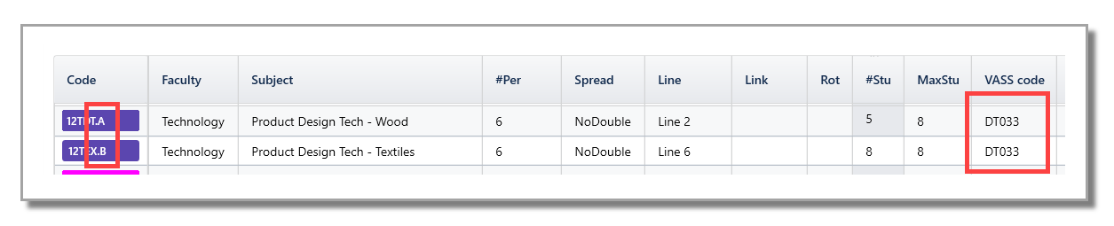 - It is important that classes that have the same VASS code (e.g. Product Design Tech-Wood and Product Design Tech-Textiles are both DT033), have different class codes/ identifiers in E10 after the course code. VASS does not use the E10 course code, but it does use the class identifier: