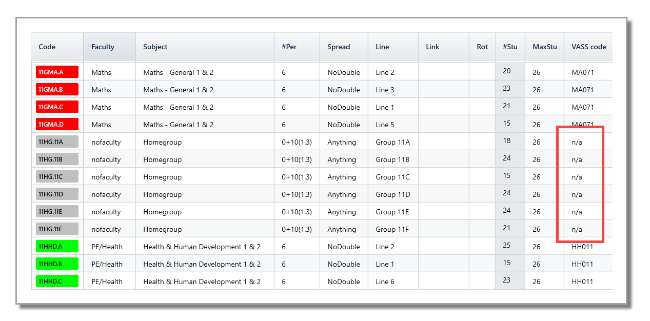- Enter n/a for classes that are not to be included in the VASS export/import, such as 'Assembly', ‘Home Group’ or 'Study'. Any such class will be omitted from the StudentPrograms.txt file.