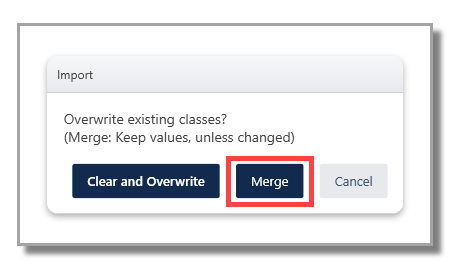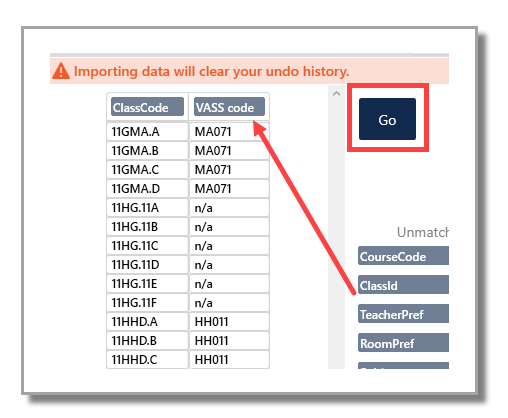Create a file that contains both the class codes and the VASS codes. The Class data (F6) screen can be easily taken to Excel by hitting the Excel icon (top-left). Columns not needed can then be easily deleted and the VASS codes can be added to the Excel import file.