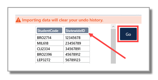 Create a file that contains both the student codes and the Statewide ID codes. The Student data (F8) screen can be easily taken to Excel by hitting the Excel icon (top-left). Columns not needed can then be easily deleted and the Statewide ID codes can be added to the Excel import file.