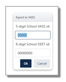 - Enter the school’s 5 digit VASS ID (VCAA School code) or the 8 digit DEET School code > OK
