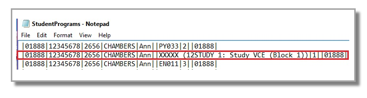 The StudentPrograms.txt export file is saved to your computer in the E10 Export folder. The StudentPrograms.txt export file consists of a single pipe-separated file, as per VASS requirements: