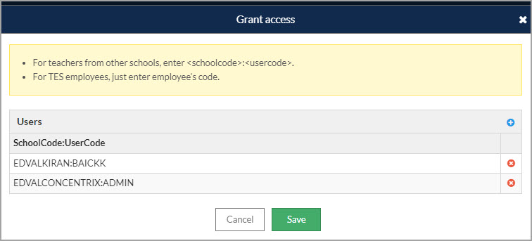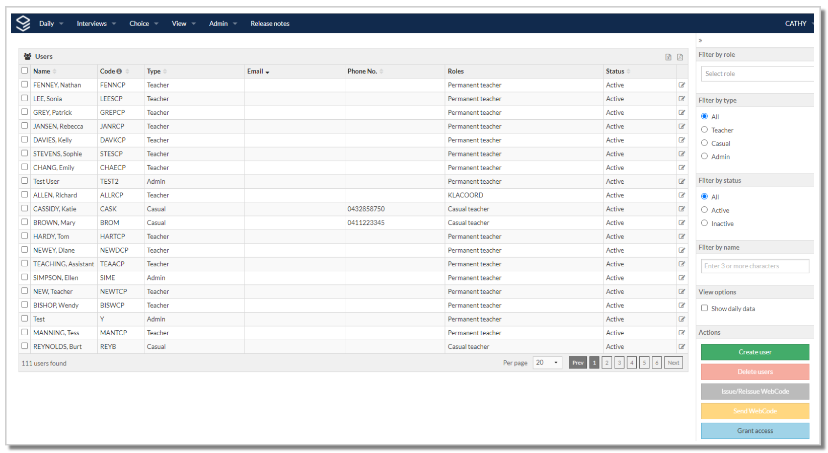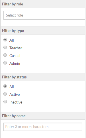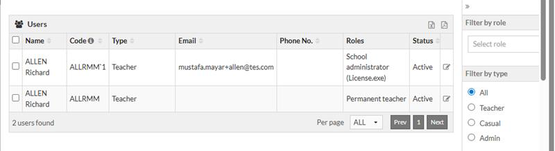 Type | Displays the user type. The types are: 1) Teacher. A teacher who exists in the most recently synced etz file. 2) Casual. A user added to the Casual group. This user does not exist in the most recently synced etz file. 3) Admin. A user added to the Admin & Support group. This user does not exist in the most recently synced .etz file. |