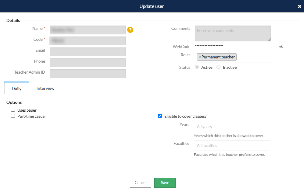 Eligible to Cover classes | This is selected by default and is only available for casual teachers and permanent teacher but not Admin staff. Year - Select the Year level you want the permanent teacher to be eligible to cover. Faculty - Select the Faculty you want the permanent teacher to be eligible to cover |