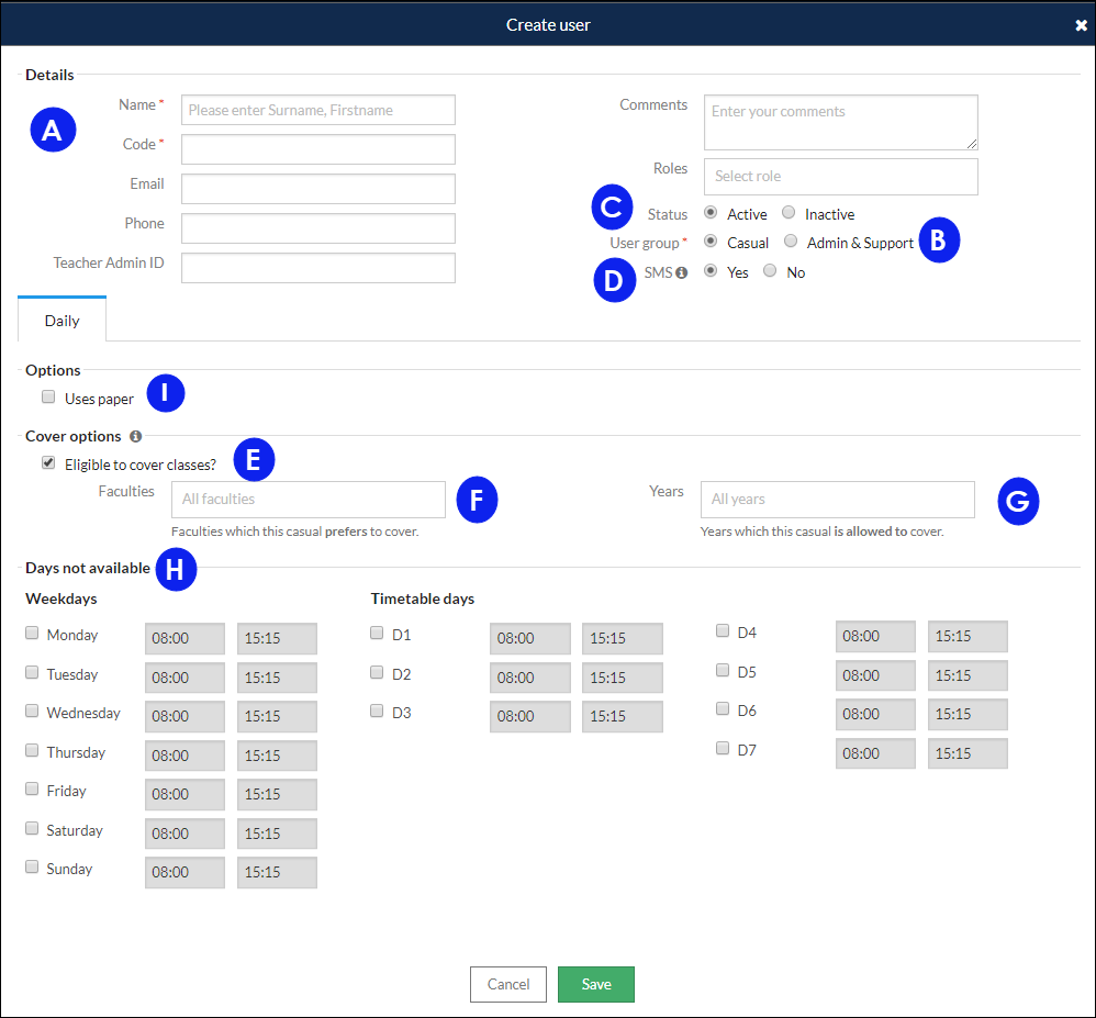 E. Daily tab - Eligible to cover classes? | This is selected by default and is only available for casual teachers, not Admin staff. Deselecting this will place the casual teacher in the 'Unavailable' tab in the Alternatives window. |