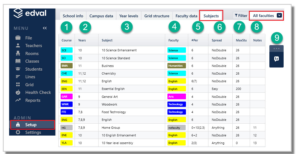 The course code for each subject, in its faculty colour. The colour for a course will match the faculty colour by default, but can be changed by double clicking or right clicking on the Course cell and selecting an alternate colour from the slide out panel.