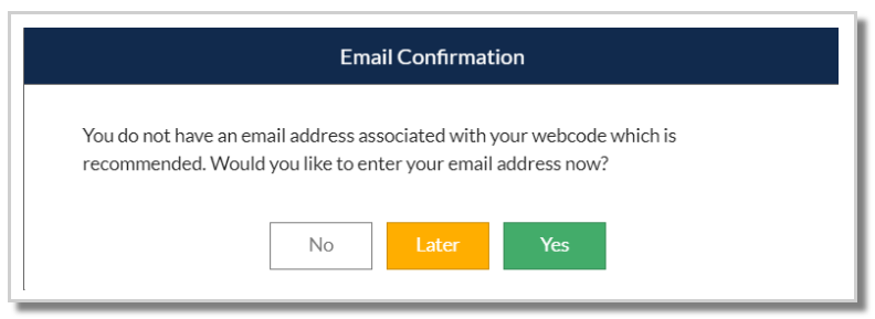 If the user selects 'Later' without adding an email address, the window will close and no further action will be required however, the message will reappear when the user logs in again.