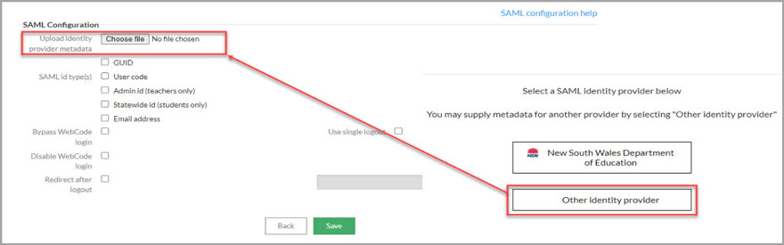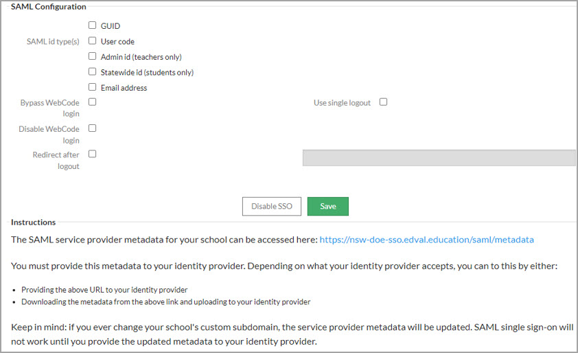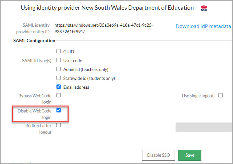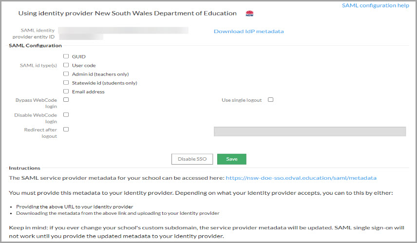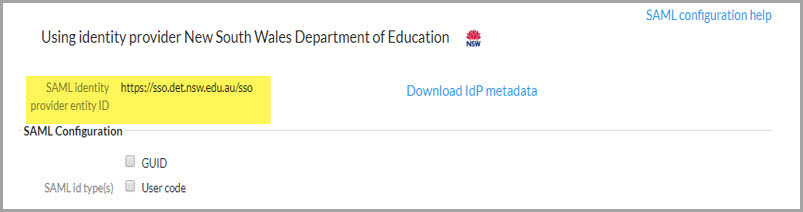 The IdP for NSW DoE schools is pre-configured. This option when selected populates as below and the settings can be tweaked if required, by the school.