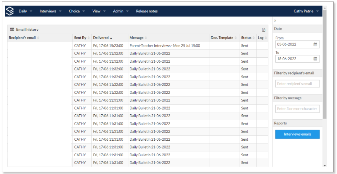 Relevant details, such as the details of the recipient, the sender, and the message are displayed along with any document templates used. Emails can be filtered by date range, recipient email or by message. Use the 'Interviews emails' button to display only emails sent from the Interviews module.