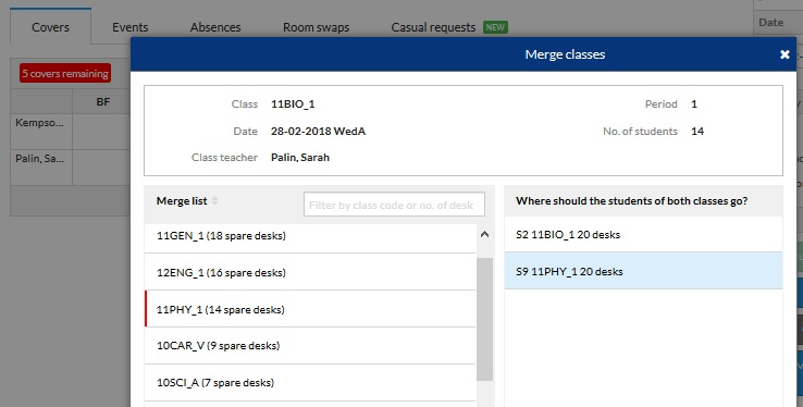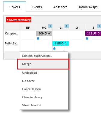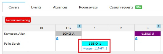 1. Covers tab: merging classes that appear for cover due to teacher absence/event attendance.