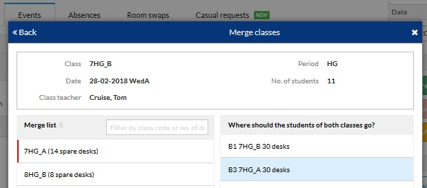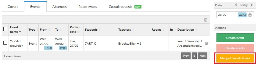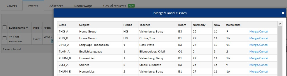 2. Events tab: merging classes that do not appear for cover due to teacher absence/event attendance.