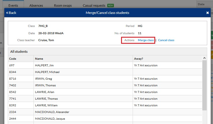 • Select a class to merge and select ‘Merge/Cancel’. A class list will appear showing which students are present and which are on the event. Select ‘Merge class’.